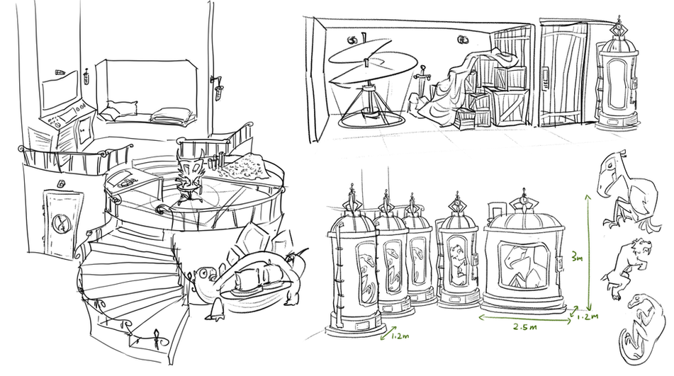 Hidden beneath the ocean, this secret hideout belongs to an evil time-traveling smuggler, filled with valuable items he has gathered: terror birds suspended in a glowing bio tank, crates of dodo eggs, velociraptor hide etc. Green ocean light filters through the windows as high-tech computers hum, turning the hideout into a silent vault, suspended beyond time itself.