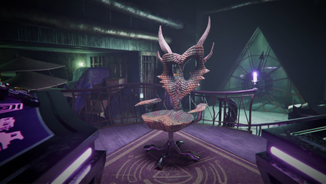 To ensure coherence between assets and lighting, the floor and walls of the hideout are green and a color palette of green, purple, and a hint of yellow is used for the props.