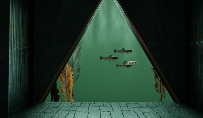 The effect is created by removing all environment lights to achieve complete darkness, then shining a light onto a large green wall to mimic how light fades as it travels deeper in the ocean. Fog and light rays with a slow-moving image texture simulate suspended particles, while flowing kelp and fish complete the illusion.